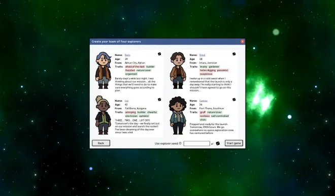 Each crew member is a distinct individual, generated procedurally at the start of each game. Your goal is to keep them alive: breathing, fed, warm, healthy, and happy. Each explorer has their own set of skills, traits, and opinions they will not hesitate to share with other crew members. Their conversations and diaries are an integral part of the story and the gameplay, helping you figure out how to best utilize their skills in a challenging environment.