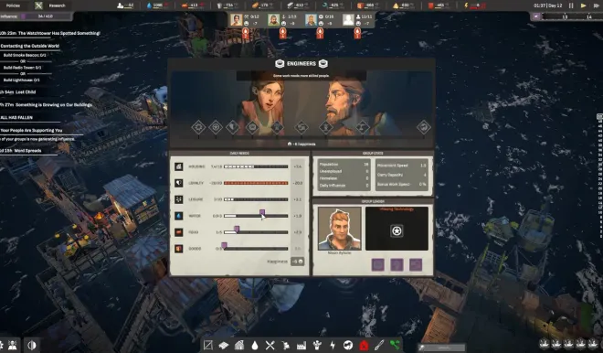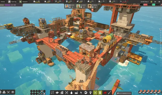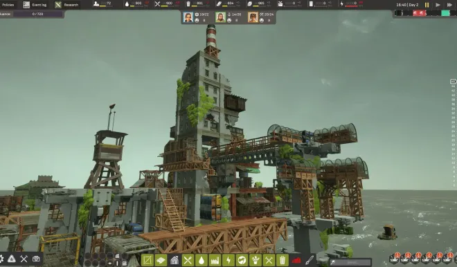 Send the survivors to scavenge the long-lost world, overtaken by the ocean, for precious resources and building space. Receding tides uncover new areas and resource nodes, reachable with machinery, ladders, explosives, and other means.