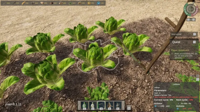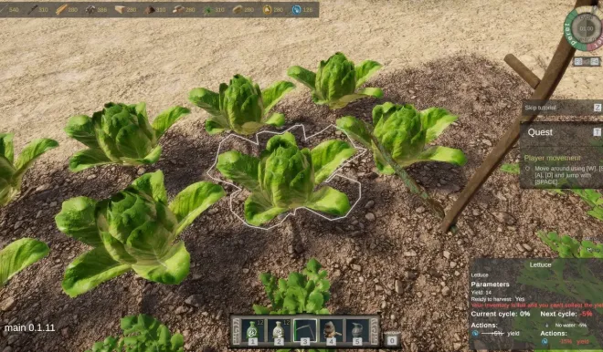 • Manual crop cultivation with growth stages, watering, fertilizing, and rot