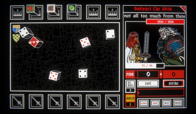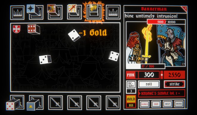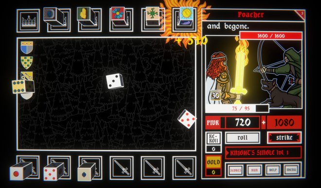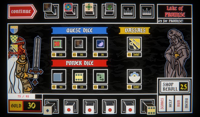 You’ll begin each run with a simple set of dice, but between battles you’ll stop at shops to expand and refine your collection. Some dice tilt the odds in your favour, others amplify your scores, and a few can backfire entirely, unless you’ve saved enough re-rolls to turn the tide. It’s up to you to experiment and discover the perfect combinations to save King Arthur and smite his foes!