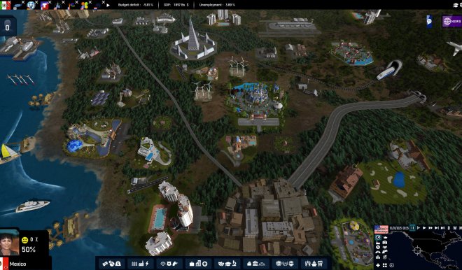 The player can also construct elements on the world map, which will change accordingly: nuclear plants, wind farms, military bases, pipelines, high-speed train lines, airports, and many more.