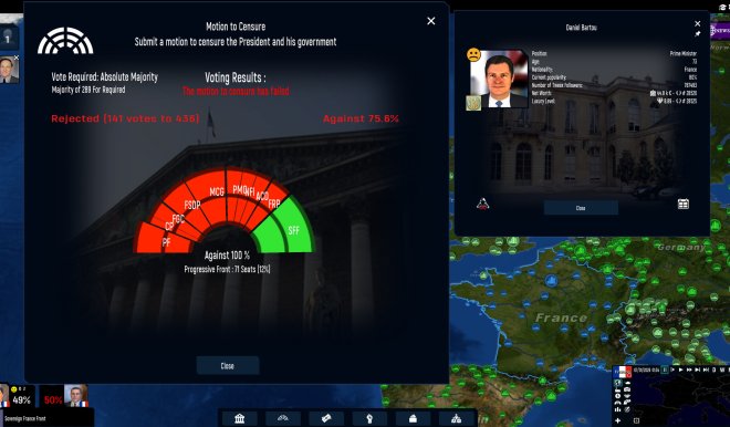 Various systems of censure practiced in the world are reproduced here: motion against the head of state and/or their government, constructive vote of no confidence, vote by simple or absolute majority, dissolution of Parliament, vote of confidence on a legislative bill, and a case of Article 49.3 in France. As the head of state, the player must face these attacks led by the opposing party AI. Conversely, as the head of the opposition party, the player can attempt to bring down the regime to trigger new elections or take their place. Political influence and communication, the formation (or destruction) of political coalitions, are essential to emerge as the winner in these situations.