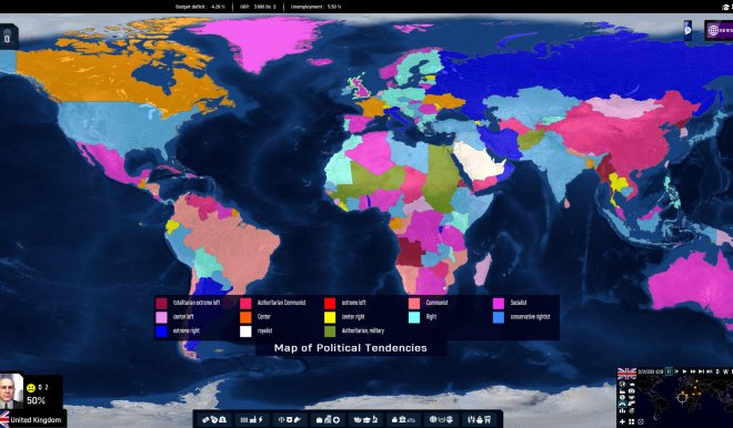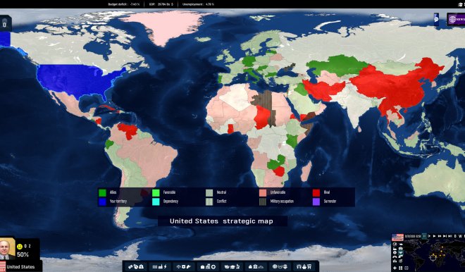 All actions of the player as head of state or opposition have repercussions, and lobbies, social groups, and important national and international figures will intervene if their artificial intelligence deems necessary (press interviews, resignations, protests, strikes, unrest, blocked roads, wars...).