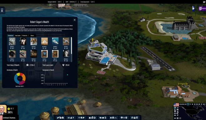 As a politician or businessman, players can grow their fortune. Various options are available: increase wealth, buy and sell valuable items (cars, private jets, paintings, yachts, diamonds...), build luxurious properties, stock market speculation… Wealth is one means to influence power, either individually or in public opinion, by creating, for example, foundations dedicated to certain causes, or by financing an association, a religion, or a political party.
