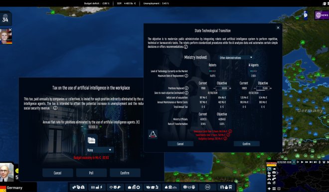 The game simulates the development of artificial intelligence and robotics and their impact on society, especially in terms of employment. The player can implement a technological transition in the State and in the public sector. They can also take advantage by taxing these technologies to compensate for the loss of jobs and redistribute the economic benefits more equitably.