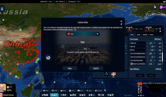 Every country and major multinational corporation is represented with its own variables and functions. The calculation and scenario engines include more than 150,000 facts and figures, 20,000 texts, and 12 hours of recorded dialog. An ultra-detailed and animated 3D map with vegetation, bodies of water, every border, regions, production facilities, and important strategic sites around the world becomes your playground.