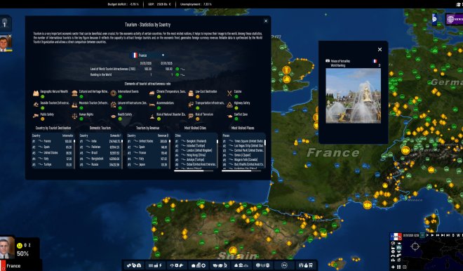 Various components are taken into account in the calculation of tourist attractiveness that the player can develop as head of state or CEO of a tourism business by building, subsidizing, budgeting, or influencing...natural wealth, cultural wealth, international events, cost of living, tourism infrastructures (seaside, leisure, mountain), accommodation packages, quality of transportation, public safety, highway safety, terrorism risk, climate, cuisine, risk of natural disaster, sanitation, human rights...
