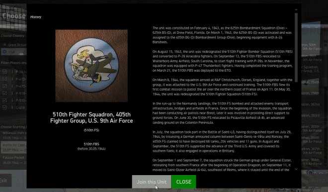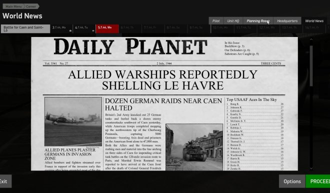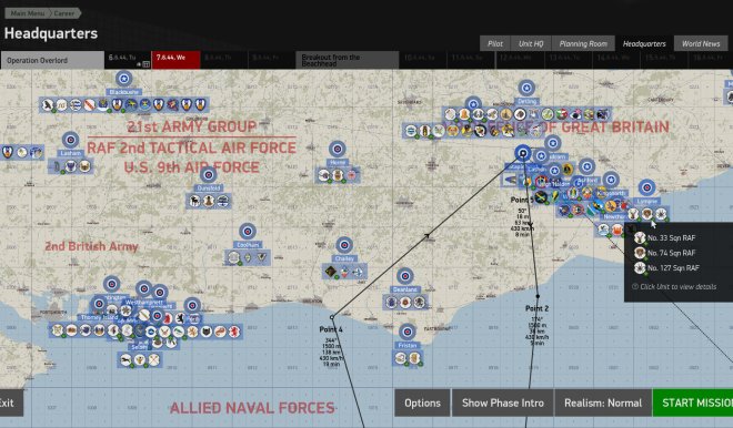 Another step forward in complexity is the Career mode: here you can join one of more than 100 historical American, British or German squadrons and complete missions day by day, earning awards and rising in rank - after becoming a commanding officer you can direct your subordinates and alter the mission plan. Mission types change and represent the real missions this squadron was performing on this day. The frontline shifts and the weather changes according to history, ground forces capture or lose airfields and squadrons fly rebase missions. You can even can ask to be transferred to another unit or read a newspaper with news articles of the time.