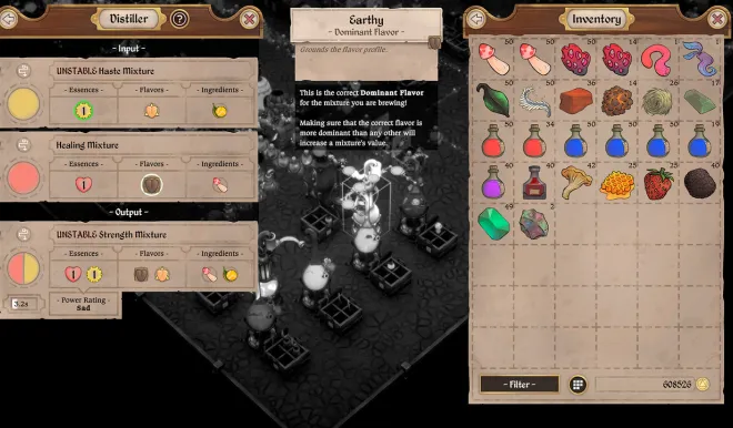 Create fully automated production pipelines from a varied catalogue of workstations to produce potions. Balance liquid ratio, maximize potency, pick the right ingredients, balance flavors and pour it all on the fanciest bottle you can craft to create the potion!