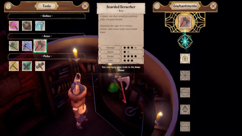 A mix of colorful illustration designs with a pinch of cheeky classic fantasy humor but still an alchemically-cozy experience. Different environments to explore and gather your ingredients. But be careful! Some flora and fauna will fight back…