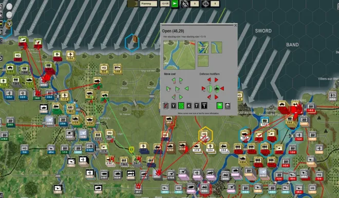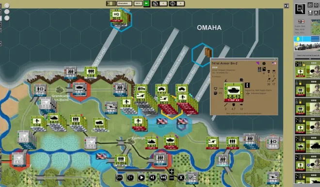 WEGO World War II: Overlord includes multiple interconnected campaigns and stand-alone scenarios, featuring the iconic battles across Normandy’s hedgerows, the breakout towards Brittany, and the struggle for key cities like Caen and Cherbourg. The game uses stylized maps of Normandy over which a hexagonal grid system has been superimposed. This grid regulates land unit placement, movement, and combat.